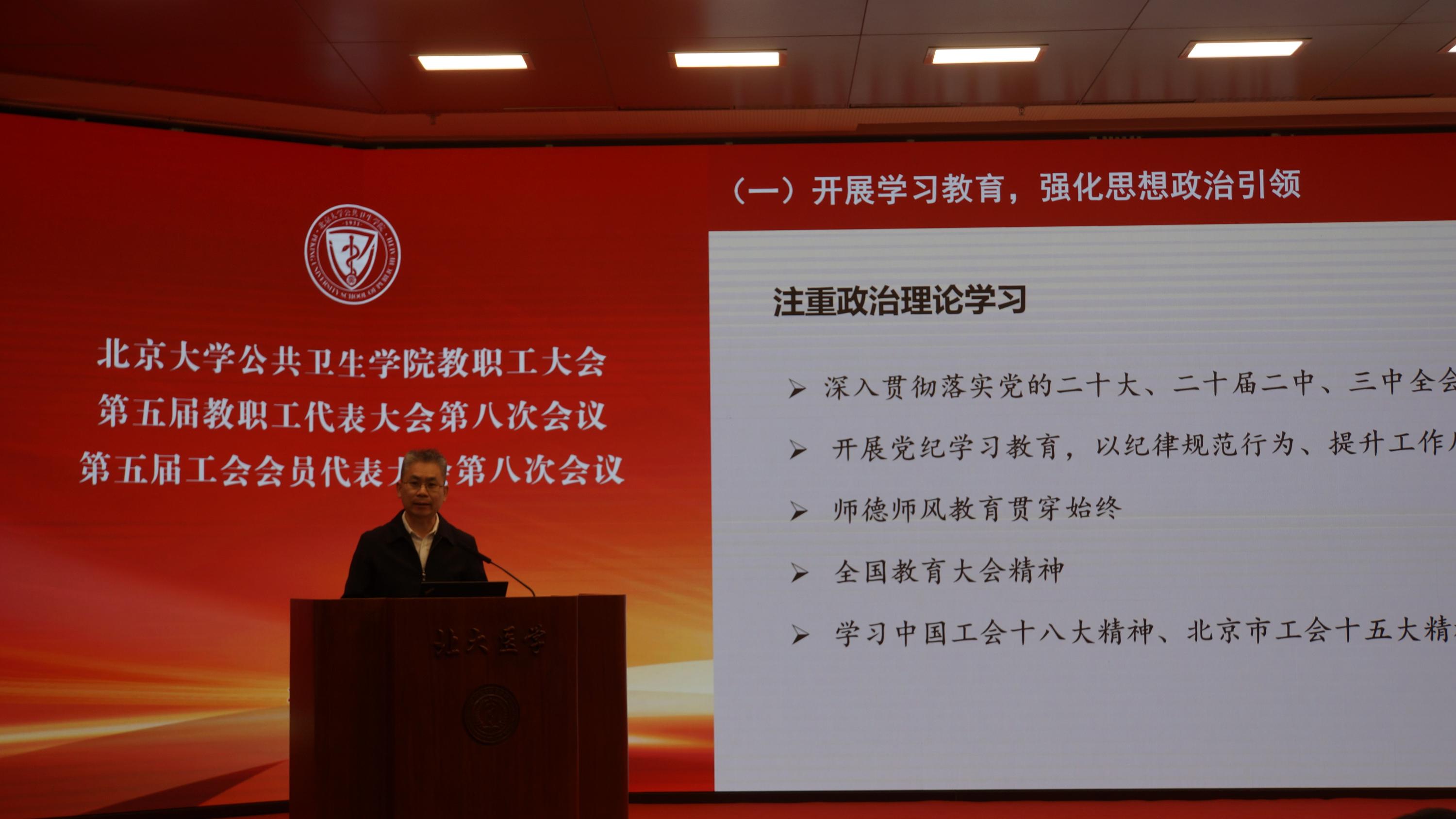 随后,学院党委副书记、工会主席苏鸿以《用心用情 履职尽责 以服务为宗旨构建公卫之家》为题,从强化理论武装、注重民主管理、服务发展任务、聚焦身心健康、激发基层活力、加强自身建设六个方面对2024年学院教代会、工会工作进行总结,从职能定位要准、活动内容要实、工作方法要活、干部队伍要强等四方面介绍了工作的体会和认识,并从强化思想引领、深化民主建设、维护教职工权益、实施教职工健康促进工程以及做好工会干部的教育培训等五方面进行了工作部署,指出2025年教代会、工会将在学院党委和上级工会的领导下,全面深入学习党的二十届三中全会、中国工会十八大和北京市工会十五大会议精神,团结全体教职工,贯彻围绕中心、服务大局、激活基层指导思想,更好地谋划推进工会工作,维护和服务好教职工,为学院高质量发展做出新贡献。