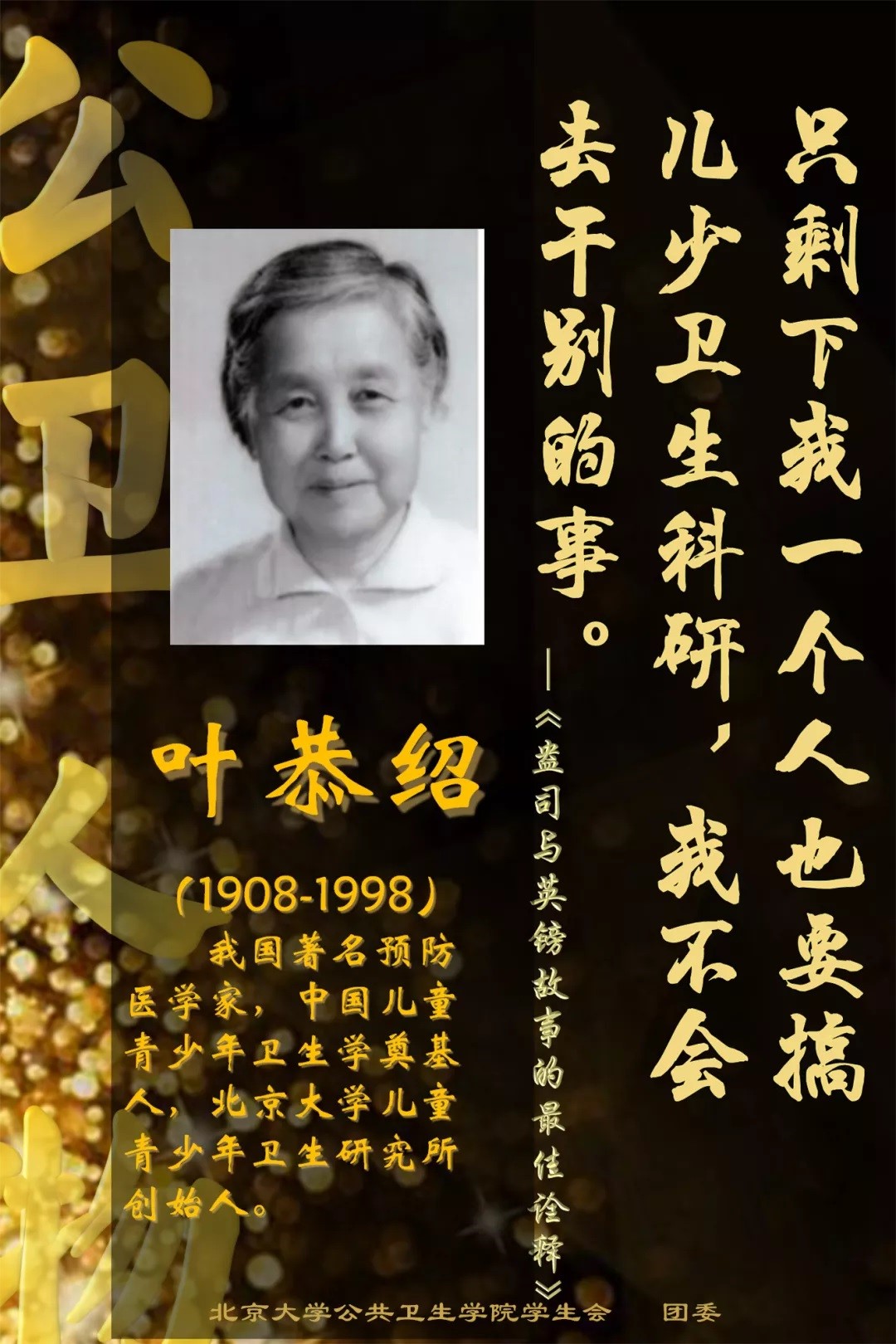 叶恭绍教授1908年出生于广东番禹县。1935年毕业于北平协和医学院,获医学博士学位。她在协和医学院读书期间受到了公共卫生学家“一盎司的预防胜于一磅治疗”这句名言的启示,她的朴素的为人民、为社会服务的思想,促使她选择了预防医学、妇幼卫生作为她终身为之献身的事业。