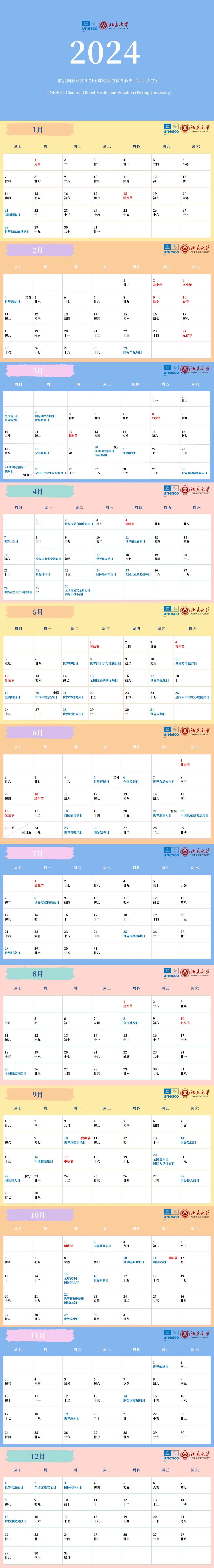 过去的一年,教席协调组织多位公共卫生、基础教育和健康传播领域专家,整理分析全球将近200个和健康相关的主题日,最终以“健康第一”和“儿童优先”原则确定了72个健康主题日,制作了2024年日历模版(见段末长图),主题日汇总表(见附件),并系统梳理了主题日核心宣传信息(每个主题日前推出),以供各级各类学校和健康教育相关行政部门参考使用。各学校、各单位、各部门使用时,可本着强健儿童青少年身心的目标,充分发挥自身优势,尽情展开想象,融入文化艺术等创意元素,形神兼备,知行合一,在健康教育和健康传播的生动实践进程中,积累沉淀可复制、可推广、可传播的鲜活案例。